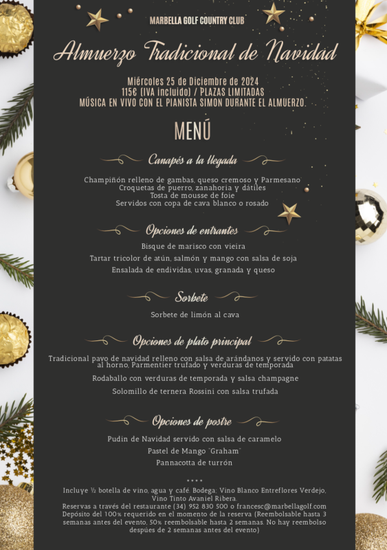 ¡Haga su reserva y convierta esta Navidad en una celebración inolvidable en Marbella Golf Country Club! Para reservas, puede contáctarnos directamente al (+34) 952 830 500 o a francesc@higueronmarbellagolfresort.com