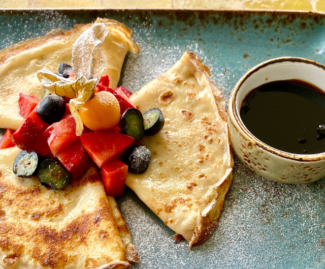 Pruebe nuestras crepes caseras, la nueva ensalada templada con nudels servida con gambas y pollo a la plancha o la ensalada especial de sandía con queso feta.
