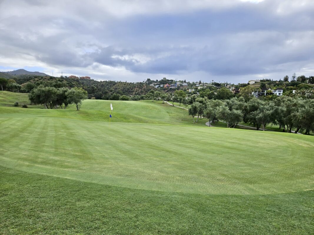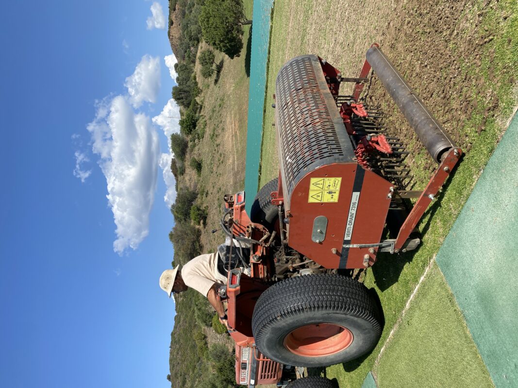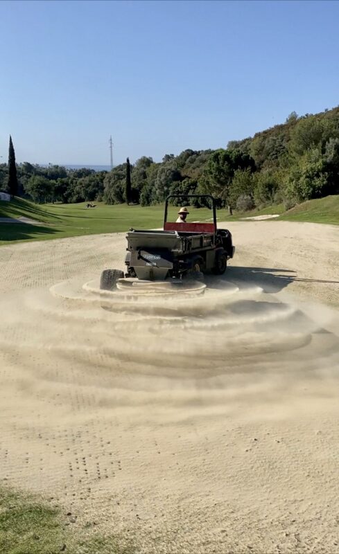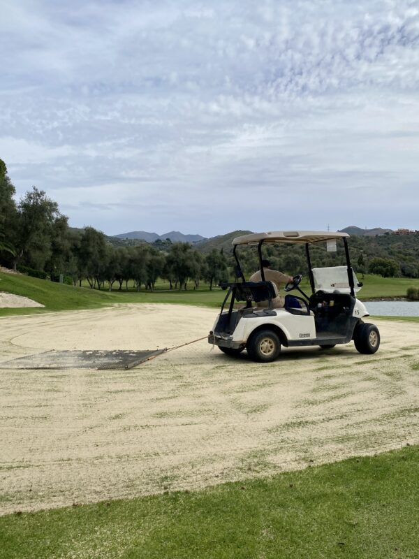 Comenzaré mi artículo con un resumen del mantenimiento al campo de golf que realizamos durante la semana del 29 de mayo al 4 de junio. Realizamos un proceso de pinchado llamado “hollow tining” en todos los greens y tees de salida. Disponemos de una máquina que introduce una varilla metálica en el green extrayendo un núcleo de césped. Los agujeros que quedan en los greens suelen tener entre 11 mm y 14 mm de ancho. Una vez que todo el green/tee ha sido pinchado, los greenkeepers arrastran los trozos de césped y los cubren con un poco de arena y fertilizante. Recebamos los greens dos veces debido al calor extremo que se espera durante el verano.