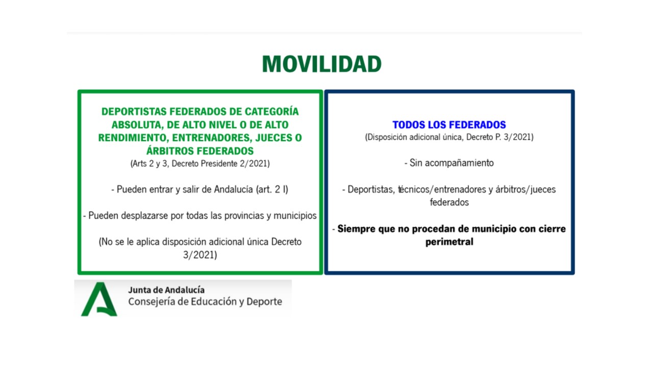 Conforme a esta nueva aclaración, se permite la movilidad por todas las provincias y municipios a aquellos deportistas federados de categoría absoluta, de alto nivel o de alto rendimiento, entrenadores, jueces o árbitros federados, siempre que el desplazamiento sea relativo a actividades deportivas federadas y competiciones oficiales.