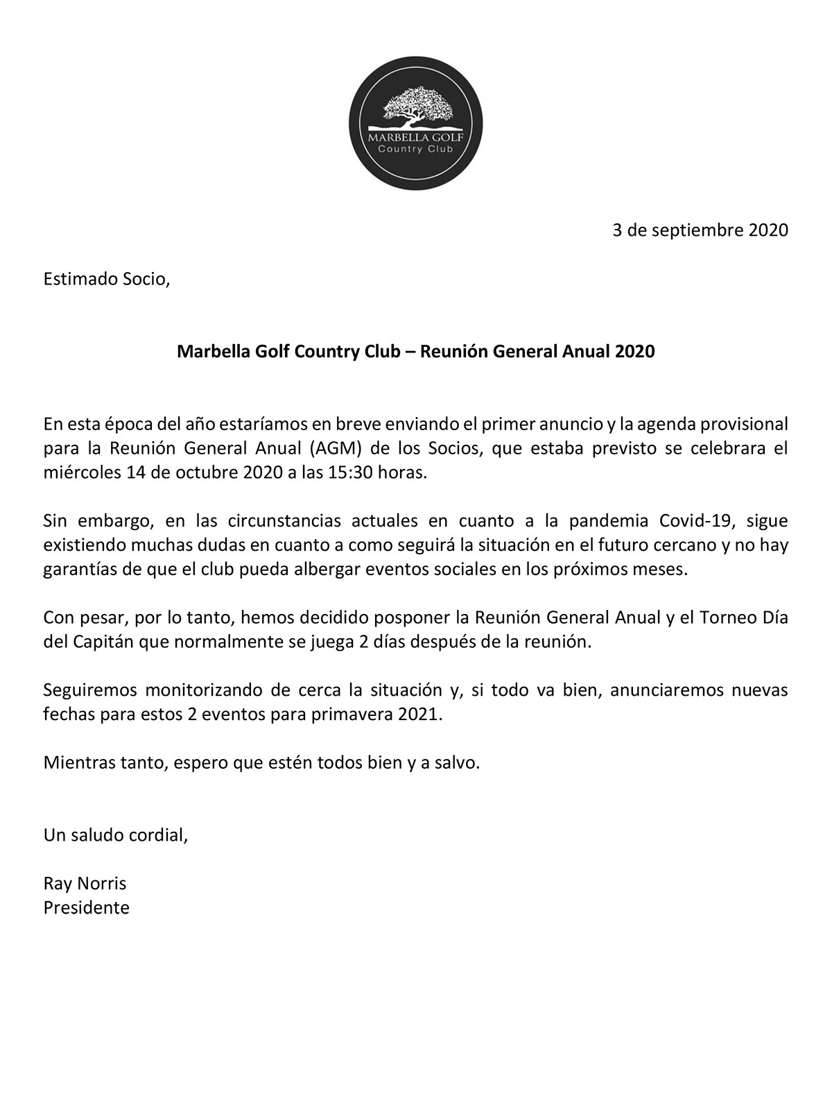 Por favor vean adjunta la carta del Presidente, Sr. Raymond Norris, referente a la Reunión General Anual y el Torneo Día del Capitán.