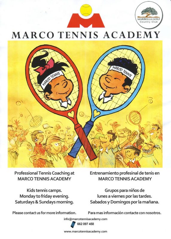 {jcomments on} ENTRENAMIENTO PROFESIONAL DE TENIS EN MARCO TENNIS ACADEMY Marcos Tennis Academy en las instalaciones de  Marbella Golf Country organiza cursos de entrenamiento para niños  durante la semana.  Los grupos  se harán  de lunes a Viernes por las tardes y los fines de semana  Sábados y Domingos por la mañana.   Si estás interesado en que tu hijo practique el tenis puedes ponerte en contacto con nosotros para mas información por email: info@marcotennisacademy.com o por teléfono: +34  662 097  458. O visita nuestra web: www.marcotennisacademy.com