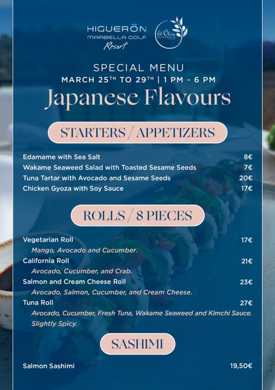 From March 25th to 29th, the kitchen at Higuerón Marbella Golf Resort will transform to offer a unique culinary experience inspired by the traditions of Japanese gastronomy. For five days, food lovers will be able to enjoy a special proposal that pays tribute to the delicate balance of flavours, textures and presentation that defines Japanese cuisine.