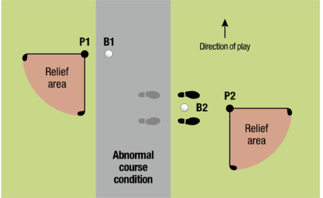 When your golf ball lands on a car path and you are entitled to a free drop, you must find the nearest point of complete relief (NPCR) from the path, which is the closest spot where you can stand and swing without interference from the cart path. Then, you drop the ball within one club-length of that point, not nearer the hole. You cannot choose any side of the path; it has to be the nearest point.