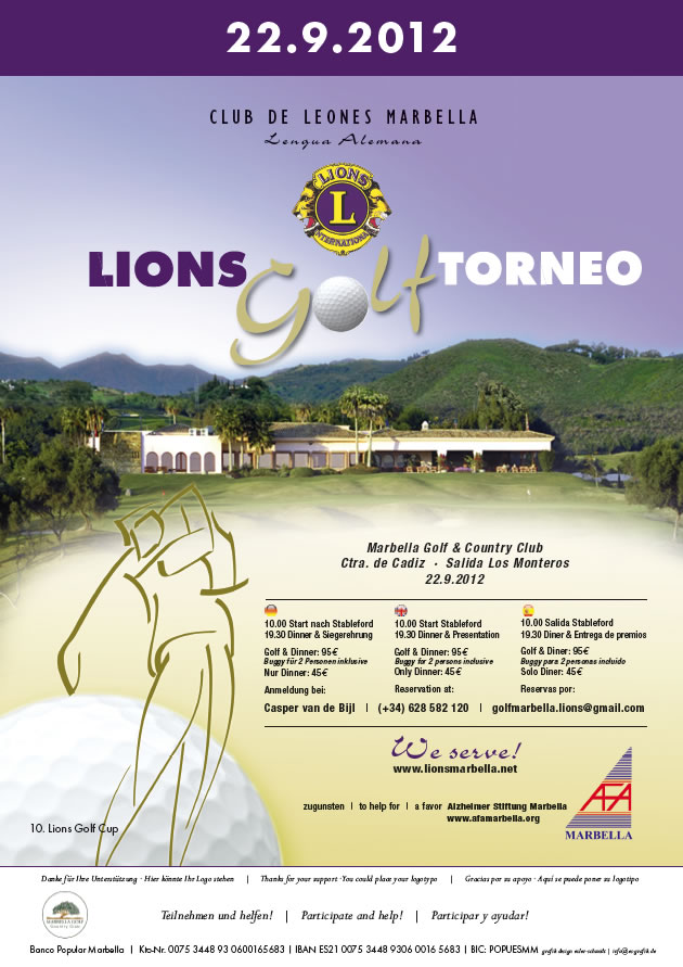 Lions Golf Club Torneo abierto el próximo 22 de septiembre – Cancelado Precio para Socios: El precio especial para socios es de 60 Euros incluyendo el torneo y la comida. Es un torneo benéfico en beneficio de AFA, Asociación de familiares de enfermos del Alzheimer en Marbella. podéis visitar su página web: www.afamarbella.org . Este torneo ha sido cancelado.