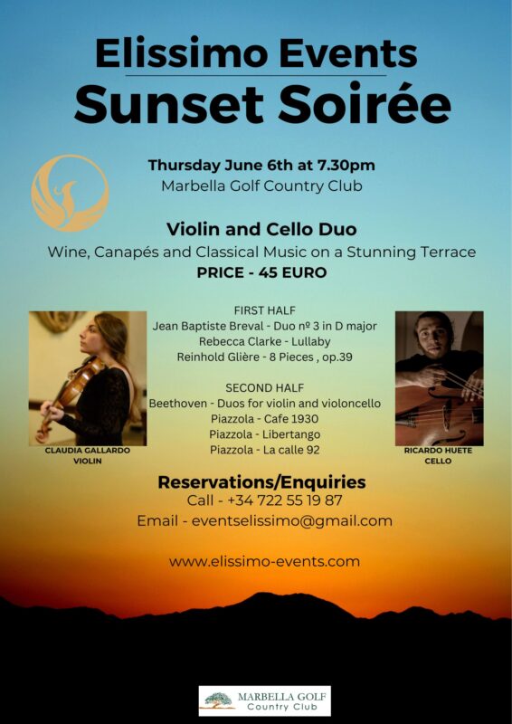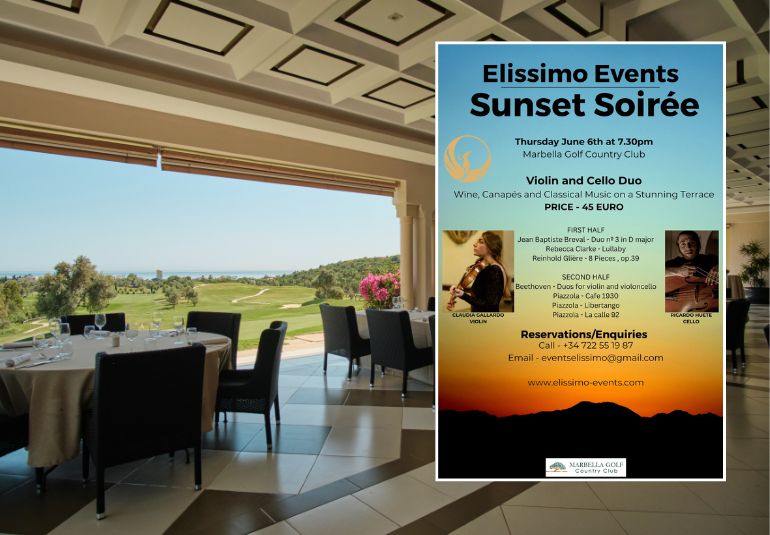 Marbella Golf Country Club and Elissimo Events present a Sunset Soirée on June 6th, beginning at 7.30pm. This evening brings something mesmerizing to the Golf Club, a wonderful Violin and Cello Duo performing classical music on our terrace as the sun begins to set.