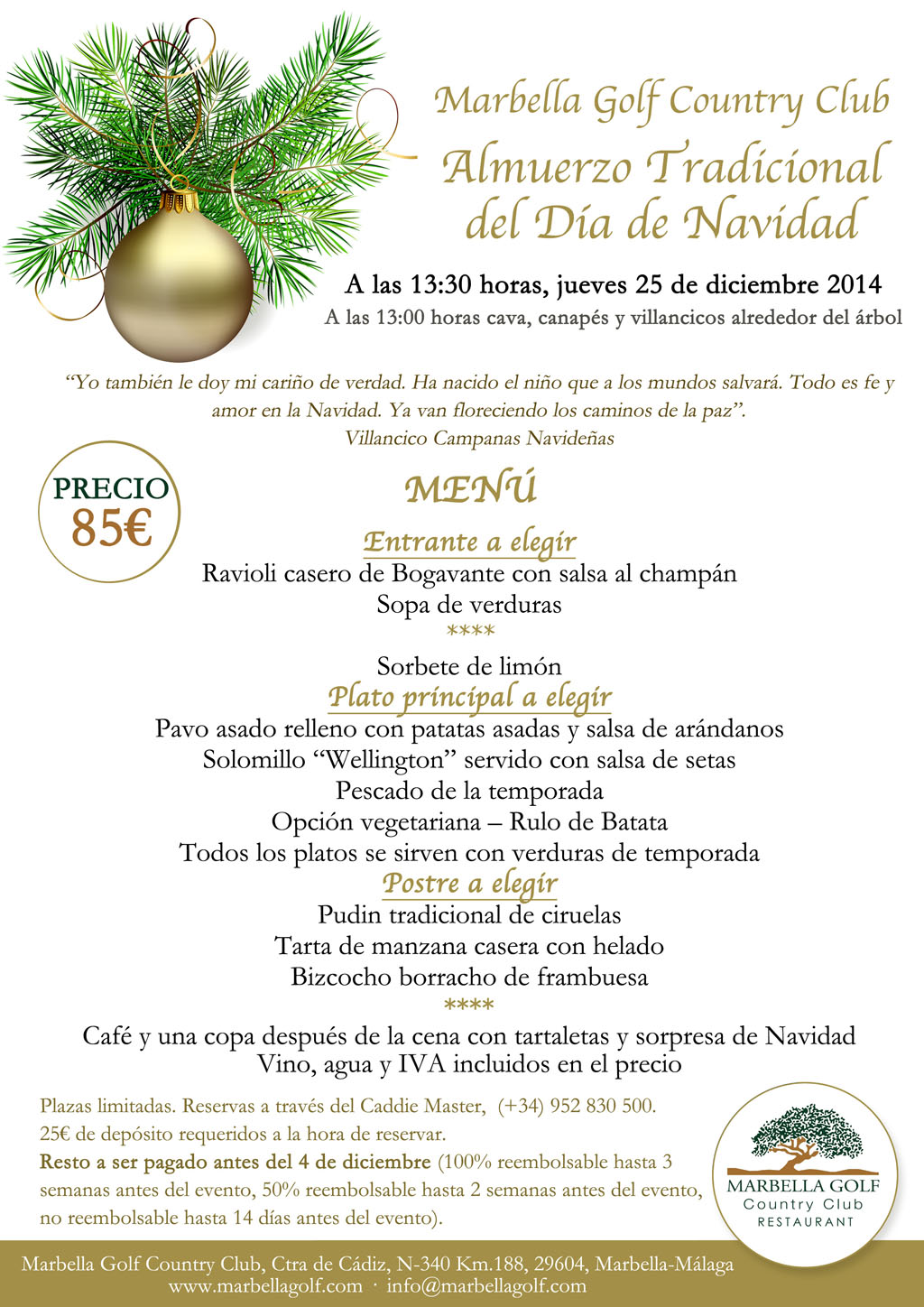 Marbella Golf Country Club servirá un almuerzo especial el Día de Navidad 25 de diciembre. Les invitamos a compartir con nosotros ese día con un menú tradicional inglés, empezando con canciones alrededor del árbol y la chimenea mientras disfrutamos de un vaso de cava y canapés seguido por el almuerzo de 5 platos. Para más información y reservas pueden contactar con nuestro Restaurante en info@higueronmarbellagolfresort.com.