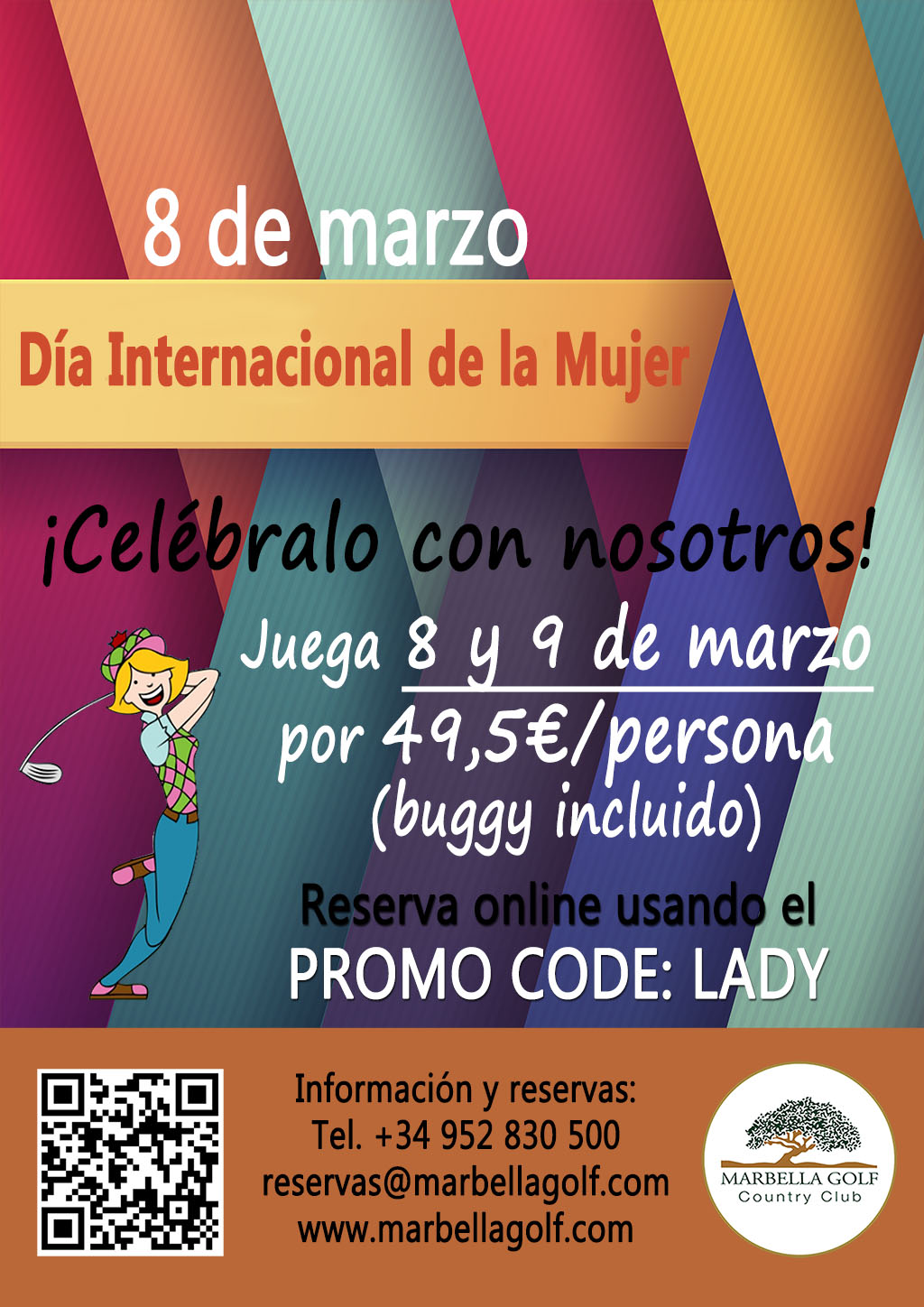 Estimadas Socias, Les adjunto el cartel de la promoción del Día Internacional de la Mujer que se celebra este sábado, 8 de marzo. Por ello ofrecemos este fin de semana el green fee de señoras a 49,50 euros incluyendo buggy por si quieren invitar a algunas amigas para jugar. Un saludo,
