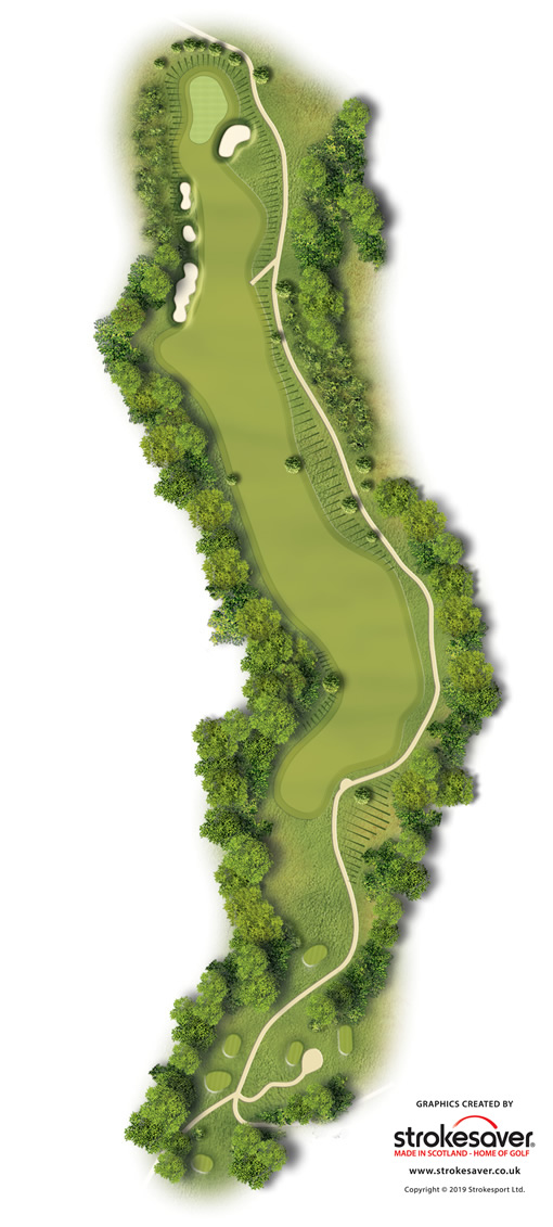 HCP: 19+:Utilice el driver o una madera para llegar a la derecha de los árboles de la izquierda. Un segundo golpe con una madera. Cuidado con los bunkers de la izquierda. Para terminar, un hierro medio/corto para llegar al green.