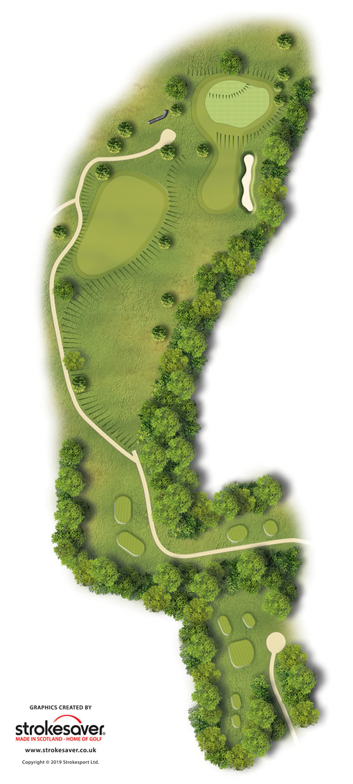 HCP: 19+:Utilice el driver intentando dirigirse hacia la parte izquierda de la calle, solo encontrará problemas en el lado derecho del tee. El segundo golpe con un hierro corto por encima de los árboles para alcanzar el green.
