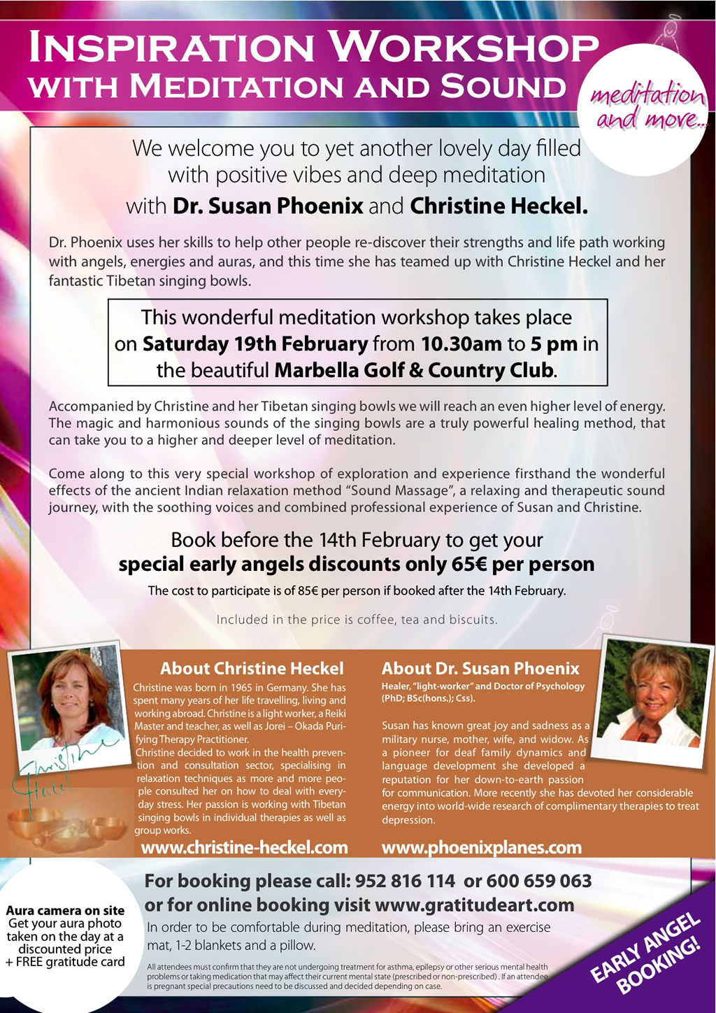 Mis queridos amigos, en una semana se pondrá en marcha el Taller de Inspiración, si alguno de ustedes está pensando que les gustaría participar, todavía tenemos plazas disponibles para ustedes. El taller estará dirigido por Sussan y por mi Christine. Esto incluso podría ser una idea estupenda para regalar en el Día de San Valentín, para compartir un tipo diferente de experiencia entre usted y su pareja junto con todos los demás participantes. Por favor, no dude en ponerse en contacto con Susana o conmigo (Christine) para informarles sobre el contenido del taller, la inscripción o cualquier otra duda que pueda tener. Se llevará a cabo en el Golf & Country Club Marbella (aparte del Hospital Costa del Sol), hay un montón de aparcamiento gratuito y se puede llegar en transporte público. Estoy deseando darle la bienvenida.